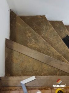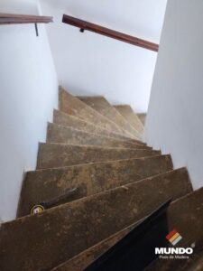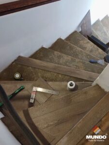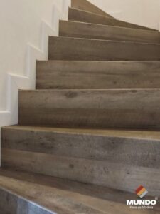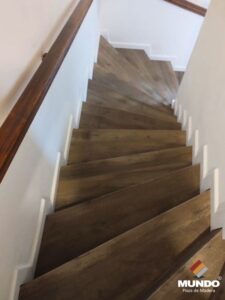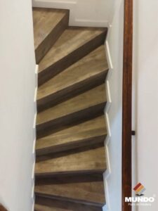 Escalera artesanal realizada con un piso vinílico de alto tránsito modelo Castaño Campestre de 5mm y 0.5 capa de uso.
