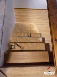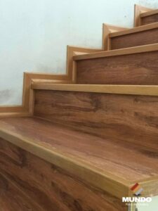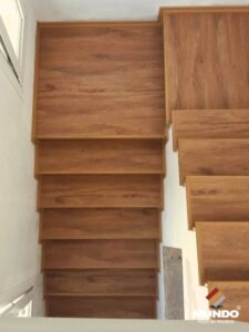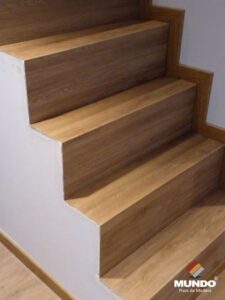 Escalera artesanal realizada con un piso vinílico de alto tránsito modelo Roble Otranto.